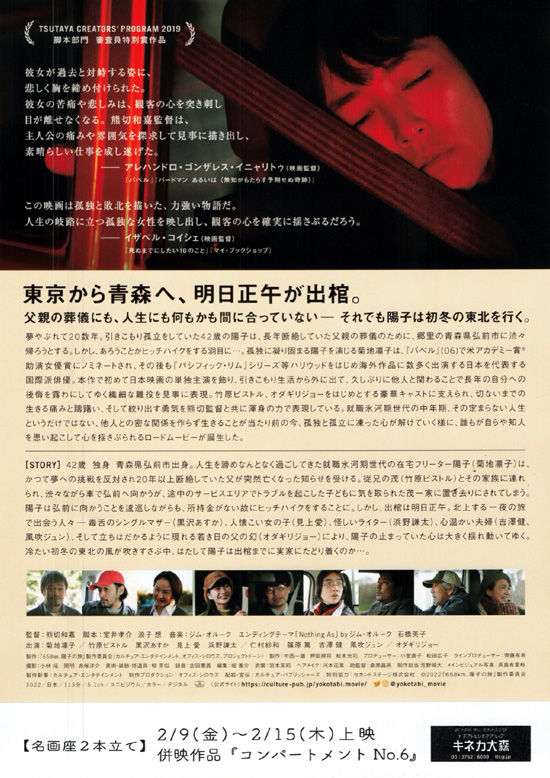 青森県弘前市出身、42歳の在宅フリーター、陽子(菊地凛子)は20年以上連絡を絶っていた父(オダギリジョー)の訃報を受ける。従兄の茂(竹原ピストル)の家族と車で向かうことにしたが、途中のサービスエリアで置き去りにされてしまう。出棺を明日に控え所持金のない陽子は故郷までヒッチハイクを試みる・・・ |
