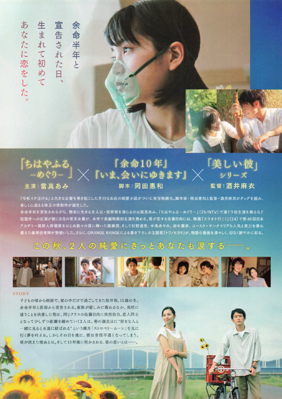 ふたつめは、もう少しリアルに描いてほしかったということ。中学まで学校に行けなかった病状の萌がなぜ高校にはあんなに元気に行けるようになったのかひっかかりましたし、病院の庭に萌の見たかった向日葵畑を作るというのも病院の庭にそんなこと勝手にできないだろうというツッコミが先に立ってしまいます。そのあと日向が萌の病室で一晩泊まるのも有りえないと思いますし、日向が寝ていたベッドは誰が用意して看護師が翌朝来た時にはなぜ無くなっていたのかが気になってしまいました。萌が無くなるシーンは、状態が悪くなって医師も看護師も来たあとなのに、酸素マスクも無く医療従事者が近くにいないことに不自然さを感じてしまいました。ストロベリームーンを見に行って池に入るシーンも海の砂浜じゃないだろうと思いました。感動のためにリアル感を無視しているように私は感じてしまい、せっかくの萌と日向の純粋な感情や、相手を好きになった理由などの感動的な内容の感動が薄まってあまり感動できず泣けませんでした。こういうストーリーには多かれ少なかれ都合の良い流れも仕方がないことだとは思いますが、この映画に対しては少しやりすぎかなと私には感じてしまいました。