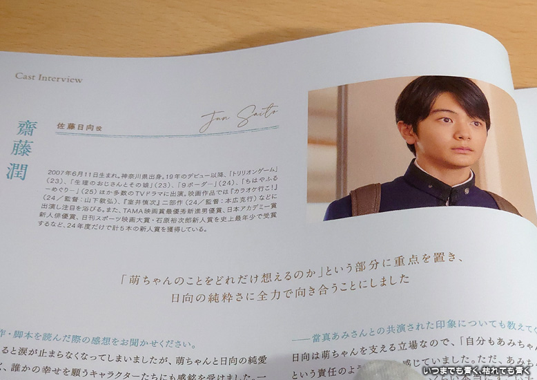 萌役の當真あみ、日向役の齋藤潤、麗役の池端杏慈は、自然で高校生らしくとてもうまく演じていて、切なく悲しい関係をよく表現していました。しかし、気になるところがいくつかあって、私好みの泣けるストーリでありながら思っていたほど物語に入り込めなくて、全体で泣けるような感じではありませんでした。