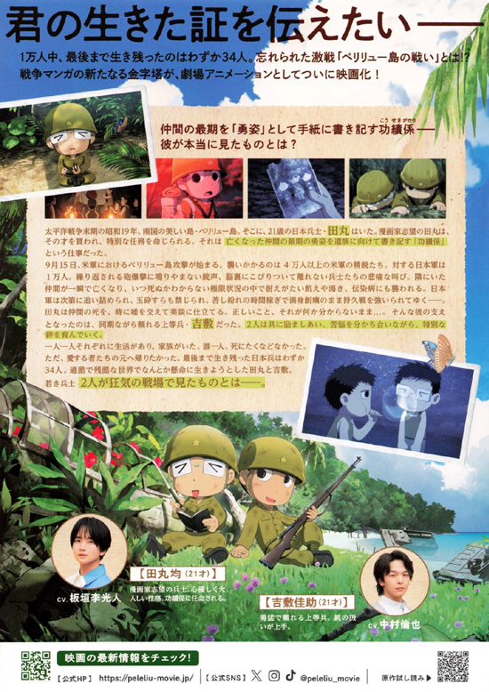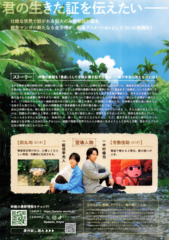 太平洋戦争末期の昭和19年、21歳の日本兵・田丸均(板垣李光人)は、南国の美しい島・ペリリュー島にいた。漫画家志望の田丸はその才を買われ、亡くなった仲間の最期の雄姿を遺族に向けて書き記す「功績係」という任務に就いていた。やがて米軍の猛攻が始まり、日本軍は追い詰められていく。いつ死ぬかわからない恐怖、飢えや渇き、伝染病にも襲われ、極限状態に追い込まれていく中で、田丸は正しいことが何なのかも分からないまま、仲間の死を時に嘘を交えて美談に仕立て上げていく。そんな田丸の支えとなったのは、同期でありながら頼れる上等兵・吉敷佳助(中村倫也)の存在だった。2人は互いに励まし合い、苦悩を分かち合いながら絆を深めていくが・・・ |