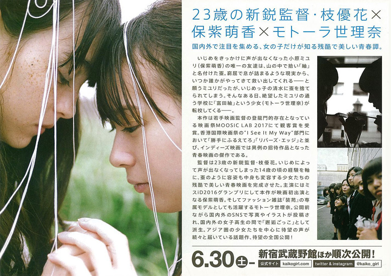 いじめられたことがきっかけで声が出なくなってしまった女子高生・ミユリ(保紫萌香)。そんなミユリの唯一の友達は一匹の蚕だった。ミユリは山の中で拾ったこの蚕を「ツムギ」と名付け大切に飼っていたが、いじめっ子の清水にその存在がバレて、蚕を捨てられてしまう。唯一の友達を失い絶望するミユリ。そんなある日、ミユリの学校に亡くなった蚕と同じ名前を持つ「富田紬」(モトーラ世理奈)という少女が転校してくる・・・ |