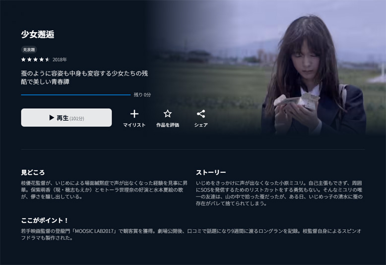 この映画は、穂志もえかの魅力を楽しむ以前に、ミユリへの酷いイジメから始まり、ふたりの女子高生の奇異な関係、富田紬という女子高生の正体などが気になって物語に入り込んでしまいました。映像的にもどう判断していいのかわからないシーンが挿入されたりして、それは現実の世界のことなのかそうでないことなのかと目を離せませんでした。