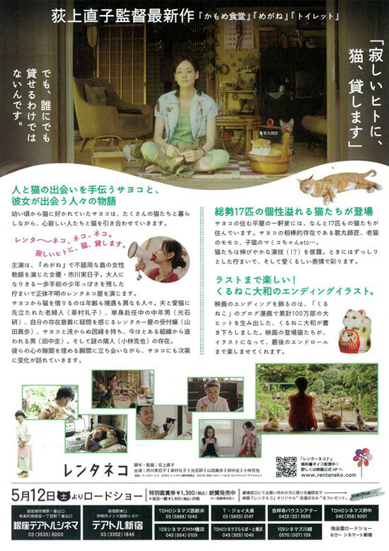 都内の一隅にある平屋の日本家屋にひとり暮らしをするサヨコ(市川実日子)は幼い頃からネコに好かれている。猫のほかに家族がいない彼女は、心さびしい人に猫を貸すというレンタルネコ屋を営んでいる。「ネコを貸すことにふさわしい条件が揃っているか」を独自に審査した上で、心寂しい人たちとネコを引き合わせている。夫と愛猫に先立たれた老婦人(草村礼子)や単身赴任中の中年男(光石研)、自分の存在意義に悩むレンタカー屋の受付嬢(山田真歩)、とある組織から追われる男(田中圭)など、サヨコはさまざまな人にネコを貸し出していく・・・ |