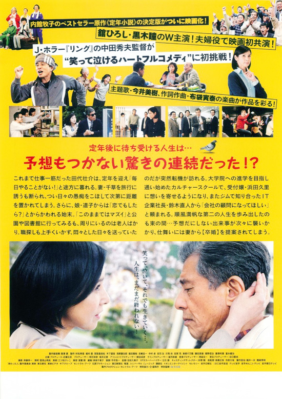 大手銀行の出世コースから子会社に出向し、そのまま定年を迎えた田代壮介(舘ひろし)。世間からは「終わった人」と思われ、仕事一筋の人生を歩んできた壮介は途方に暮れる。美容師の妻・千草(黒木瞳)は、かつての輝きを失った夫と向き合えずにいた。壮介はスポーツジムで体を鍛えたり、「どんな仕事でもいいから働きたい」と再就職先を探してみたりするが、これといった特技もない定年後の男に職など簡単に見つかるはずがなく、妻や娘から「恋でもしたら」などとけしかけられたりするが、気になる女性がいてもそう思い通りになるものでもない。しかし、すでに止まってしまったかに思えた壮介の運命が、ある人物との出会いから大きく動き出す・・・ |
