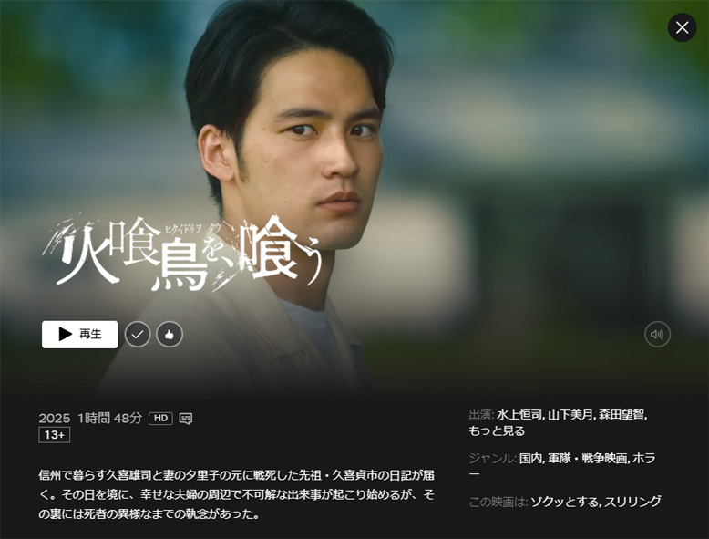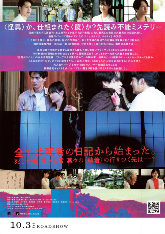 信州のとある村に暮らす久喜雄司(水上恒司)と夕里子(山下美月)の夫婦のもとに、謎めいた日記が届く。それは雄司の祖父・保(吉澤健)の兄で、太平洋戦争末期に戦死したとされる久喜貞市(小野塚勇人)の遺品だった。日記には異様なほどの生への執着が記され、最後のページには「ヒクイドリ、クイタイ」という文字がつづられていた。その日を境に、墓石の損壊や祖父の失踪など、雄司と夕里子のまわりで不可解な出来事が起こり始める。2人は夕里子の大学時代の先輩で、怪異現象に造詣が深い北斗総一郎(宮舘涼太)に、不可解な現象の解明を依頼する。しかし、存在しないはずの過去が現実を侵食していき、彼らはやがて驚愕の真相にたどり着く・・・ |