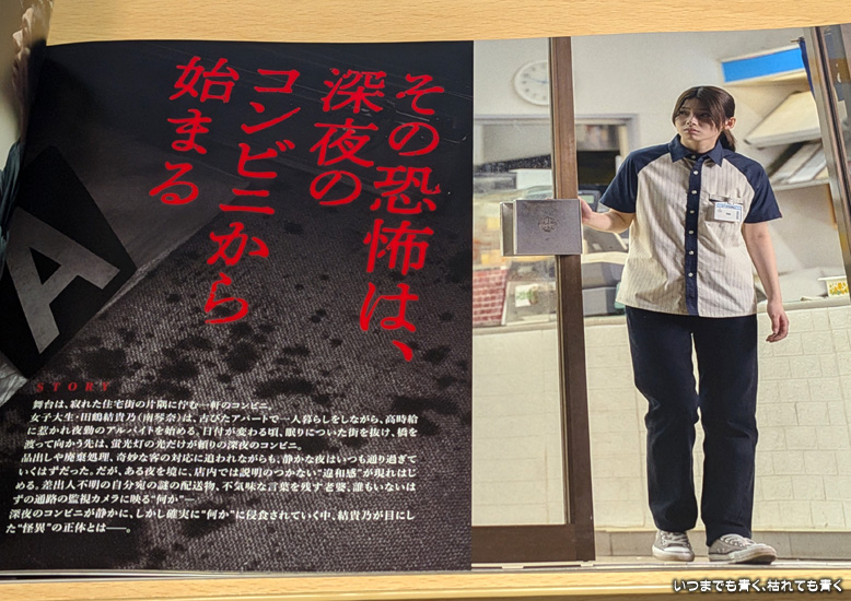 寂れた住宅街にたたずむ1軒のコンビニ。古びたアパートでひとり暮らしをする大学生の田鶴結貴乃(南琴奈)は、高時給にひかれ夜勤のアルバイトを始める。日付が変わる頃、彼女は眠りについた街を抜けて橋を渡り、蛍光灯の光だけが頼りの職場に向かう。店長の指示のもと、品出しや廃棄処理、奇妙な客の対応に追われながら、静かな夜は過ぎていく。しかしある夜を境に、差出人不明の荷物や不気味な言葉を残す老婆など、説明のつかない違和感が店内に現れはじめ、深夜のコンビニは静かに、しかし確実に“何か”に侵食されていく・・・ |