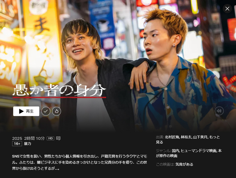 タクヤ(北村匠海)とマモル(林裕太)はSNSで女性を装い、身寄りのない男たちから言葉巧みに個人情報を引き出して戸籍売買を行っている。劣悪な環境で育ち、気づけば闇バイトを行う組織の手先となっていた彼らだったが、時には馬鹿騒ぎもする普通の若者だった。タクヤは自分が闇ビジネスの世界に入るきっかけとなった兄貴的存在の梶谷(綾野剛)の手を借り、マモルとともに裏社会から抜け出そうとするが・・・ |