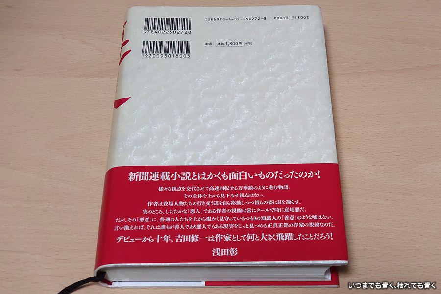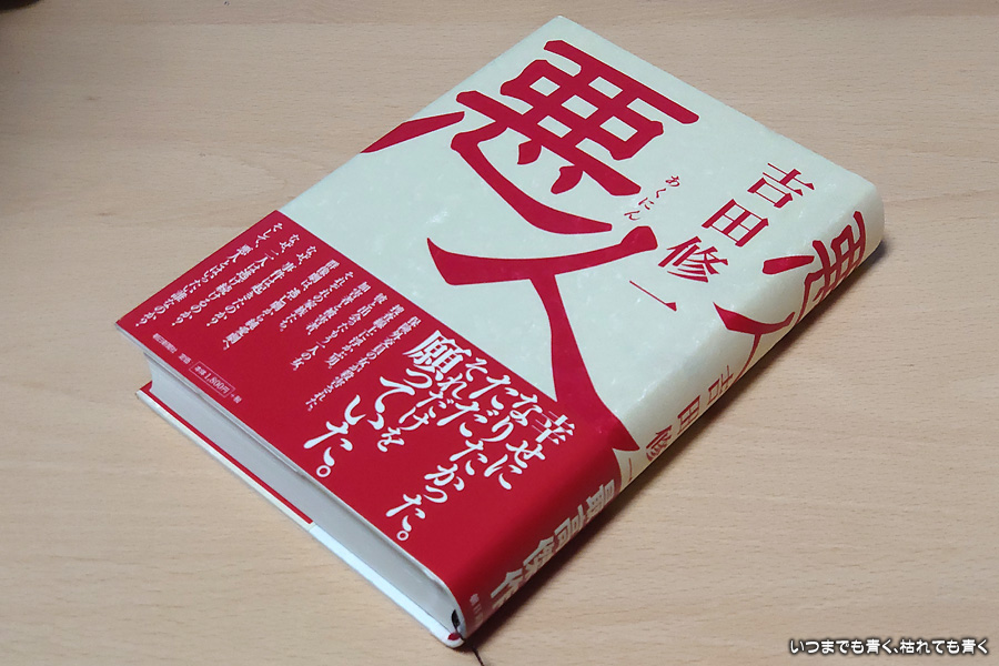 420ページの残りページが少なくなってきても、まったく「悪人」の気配すらありません。勘のいい読み手ならばその意味を少し前で気付きはじめるのかも知れませんが、私は最終ページの最後の行で、「悪人」というのをタイトルにしている理由がようやくわかったという次第です。この最終行をこういう形でさっと終わらせていることで、よけいにそのインパクトが強く感じられて、「そうか、やられた」という気持ちにさせられました。すばらしいエンディングだと思います。