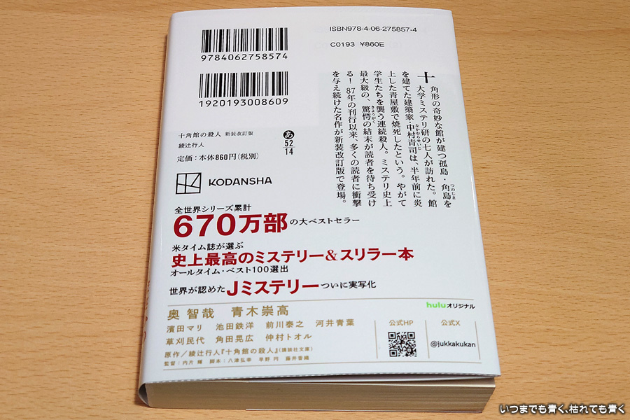 ストーリーは、十角形の館の建つ孤島に訪れた推理小説(ミステリー)研究会の大学生7人が連続殺人事件の被害者になっていくという内容です。その孤島は十角館を建てた中村青司が半年前に青屋敷で焼死したという島で、殺人事件は中村の娘の一年前の死が絡んでいて、誰が何の目的でその殺人事件を起こしたのか最後までわからないという展開です。