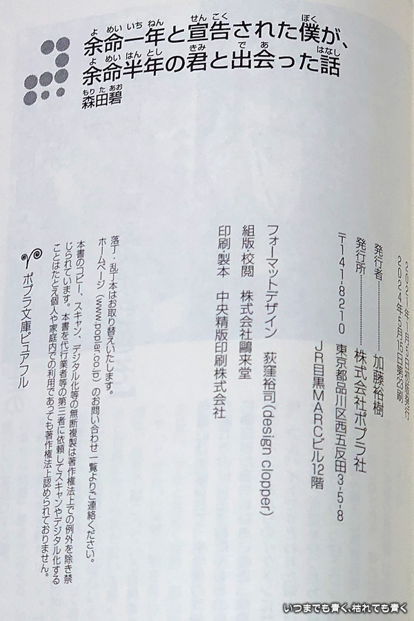 なんなんでしょうね、この小説は。秋人によって春奈と綾香が仲直りするあたりから、最後まで涙ボロボロの内容でした。クリニックで娘の診察を待つ間にも読んでいたのですが、涙があふれてくるので読むのを中断したほどです。設定自体、泣かせる設定ではあるのですが、それ以上に登場人物が、優しくて穏やかで純粋で健気で純朴で、とても魅力的なのです。好きな人や友人のために、自分のできることを精一杯やって、それによって日々が価値あるものに変化し、自分だけではなく相手も生きる力を得る、そういう生き方の素晴らしさをあらためて感じさせてくれました。それは余命に関係なく、後悔しない生き方はどういう生き方なのかを考えさせてくれる内容でした。この作品では、登場人物も相手の思いやりに対してや、できなかったことに対する後悔などで号泣する場面が何度もあります。私はそういう場面では一緒に号泣してしまうほど、私の心は登場人物に重なってしまっていたのだと思います。文章も冗長的なところはまったくなくてテンポよく進み、それでいてそれぞれの感情がとてもよく伝わる気持ちの良い文章でした。