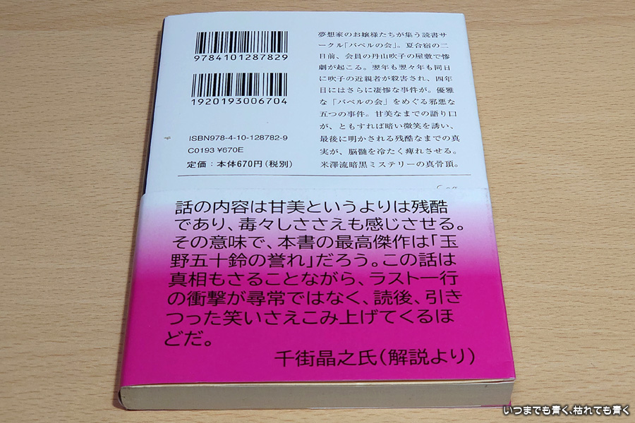 小栗家の一人娘・小栗純香は、祖母に小栗の家を守り再興することを強いていた。祖母の娘である母も純香も祖母の言葉は絶対で従わざるを得なかった。入り婿である父は祖母の眼中になかった。純香の15歳の誕生日に、玉野五十鈴という使用人を与えられた。純香と五十鈴は祖母の厳しい目を逃れて、友人のような関係を築いていった。大学に進んだ純香は「バベルの会」のメンバーとなり、五十鈴も手伝いで参加するようになり、蓼沼での夏の読書会を楽しみにしていた。しかしその前に、純香の父の弟が殺人事件を起こした。純香はそのことで跡取りの座も五十鈴という存在も奪われることになった。その結末は・・・ |