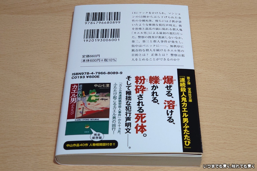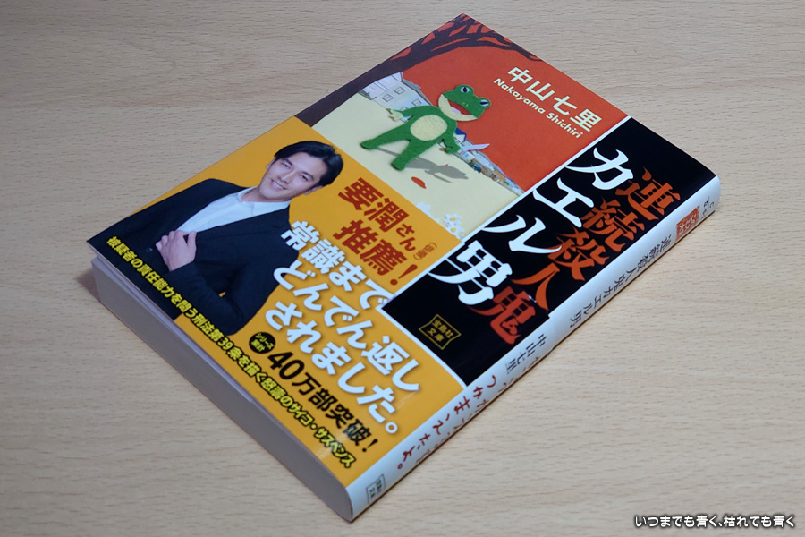 そういうストーリーと話の構成の見事さは面白くて素晴らしかったのですが、殺人の描写や古手川の暴徒や犯人との戦いの描写は、ちょっと目を背けるような表現が多くて、想像すると卒倒してしまいそうなところもあります。そこはもう少しソフトでもいいんじゃないかなと思いましたが、最後まで読むと、「カエル男」という呼び方も含めて、この物語に不気味さや異常性を与えるという意味では必要なのかなと思ってしまいました。ただ、そうだとしても古手川の戦いのシーンはちょっと冗長かなという感じはしました。