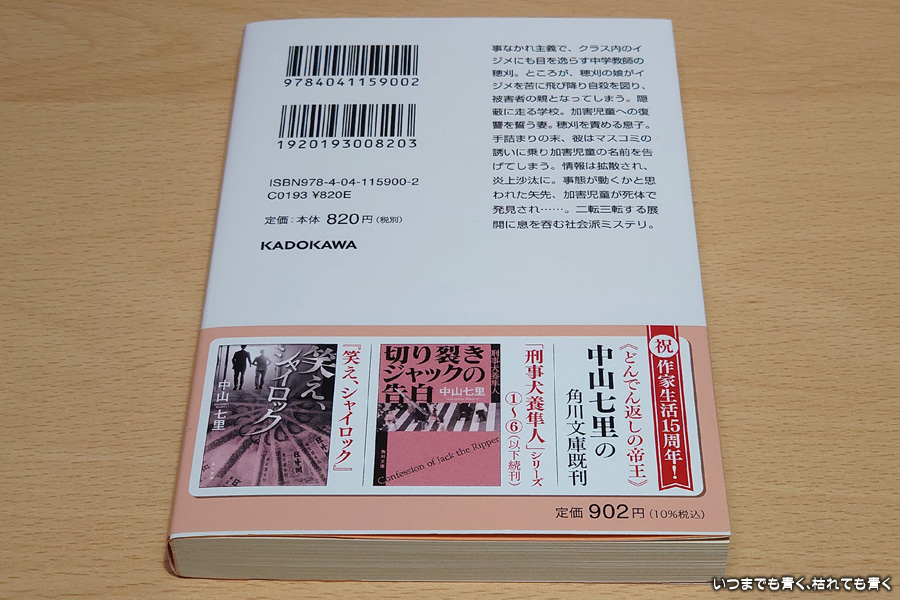 イジメの加害者・大輪彩を殺した犯人はいったい誰なのか、信じられなくなっていく穂刈家はどうなるのか、最後まで興味深く楽しめる作品でした。合わせて、「学校という組織の中でのイジメ問題に対する対応」、「ネット社会での匿名による行き過ぎた攻撃」、「そもそものイジメ問題の本質」などの問題をしっかりと描かれており、共感する部分も多かったです。自分自身も、娘へのいじめ問題で、イジメをしていた子供の親に文句を言った時の相手の反応や、学校の先生と話し合った時に理屈や正論がまったく通じなかったもどかしい思いや怒りを思い出してしまいました。また、ネットで叩かれるということも少し経験しているので、マスコミやネットの無責任な正義感への嫌悪感も感じてしまいました。