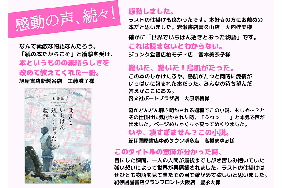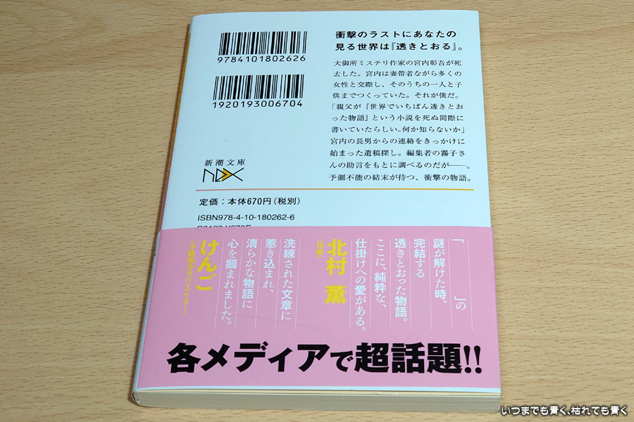 そして、最後にその小説は誰のためだったのかがわかり、透き通っているという意味も明らかになります。それはまったくの予想外の展開で、たぶん読者は一人として予想できなかったのではないかと思うくらい意外性のある結末でした。この小説自体が、宮内彰吾のアイデアで書かれた「世界でいちばん透きとおった物語」であったわけです。