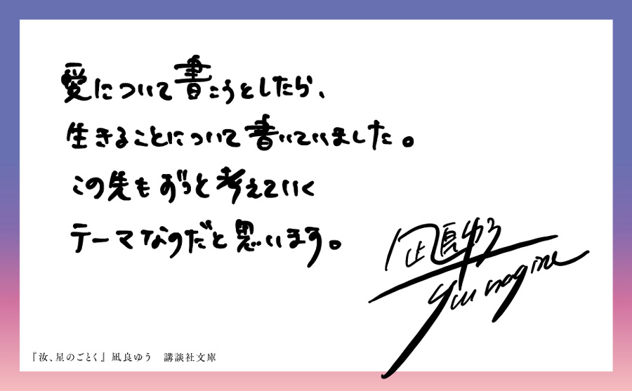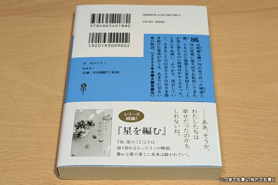「月に一度、北原先生は奈々さんに会いに行く。」から始まる、暁海の夏のある日の夕暮れ時。暁海は、見慣れた砂浜に腰を下ろして東京から届いた、櫂の書いた小説「汝、星のごとく」という本のページを開くのだった・・・ |