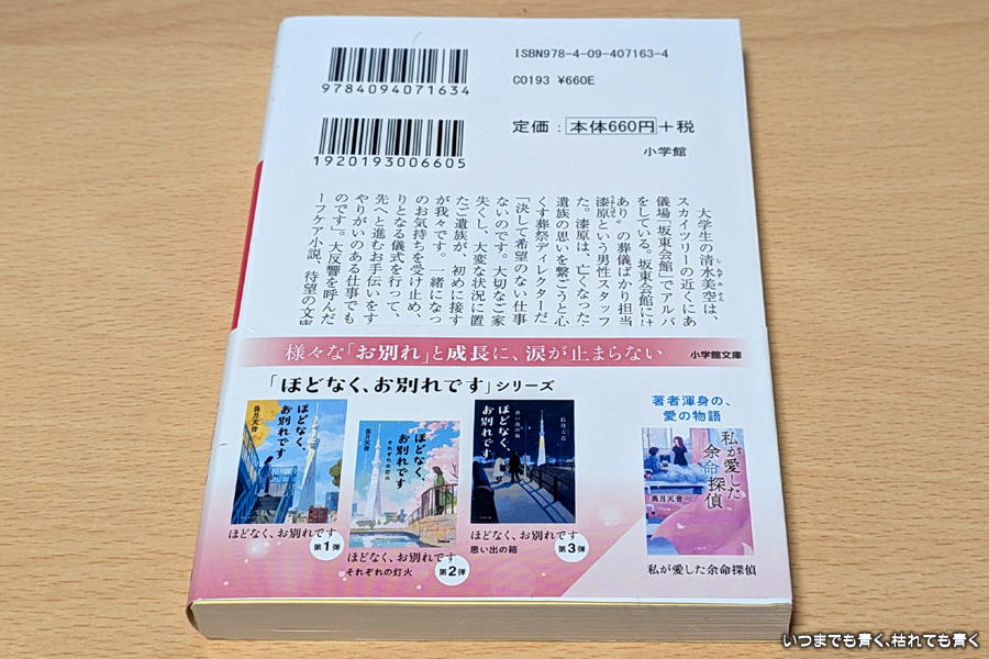 今回、奥さんと娘の通院に付き添ってクリニックの待合室で読んでいたのですが、途中で涙が出てきて鼻をすするという恥ずかしい状況になってしまいました。単なる葬儀ものではなくて、遺族が納得する葬儀をしてあげたいと思う漆原と、姉が亡くなっていることから霊感があって亡くなった人の思いを感じることのできる美空によって、残された人と逝ってしまった人の心を繋ぎ、納得してお別れができるように尽くす心打つ物語となっています。なぜその人が亡くなったのか、何が心残りとなっているのか、そんなことが明らかになっていくミステリー要素もあって、その意外性によってよけいに心が揺さぶられます。漆原のキャラクターも毒舌は優しさの照れ隠しにも感じますし、仲間と話す時と葬儀の時とのギャップも魅力的です。美空はそんな漆原を尊敬し頼りにしているので、ふたりの関係も素敵です。