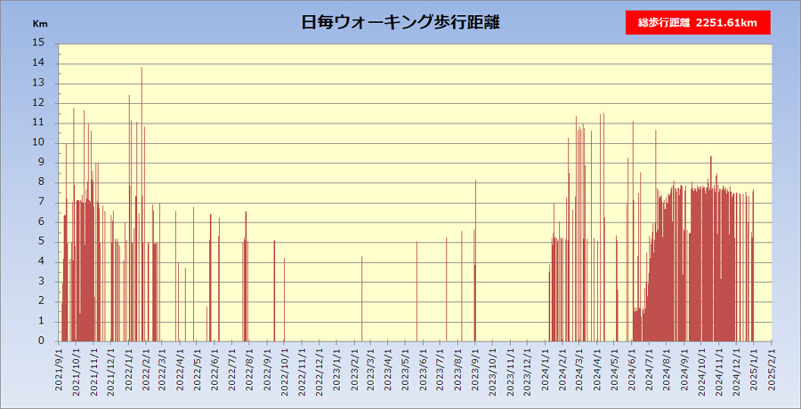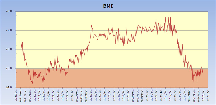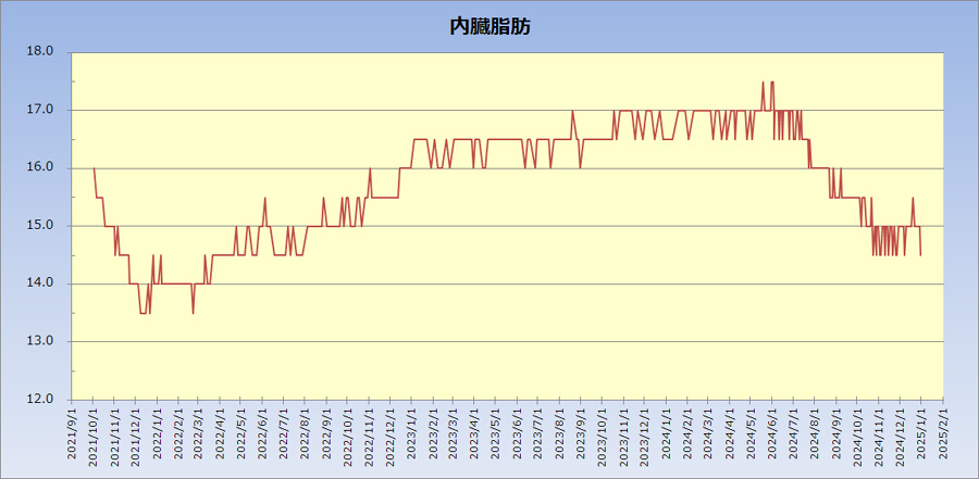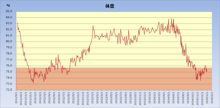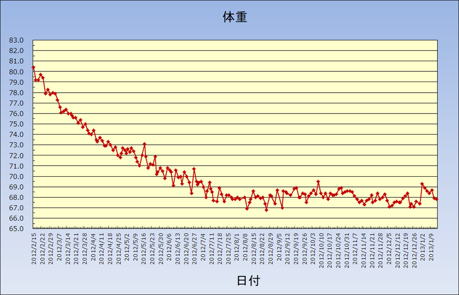 体重が増えると、お腹の出っ張りだけではなく肝機能の低下など身体によくないことが起きます。80kgを超えると危機感をもってダイエットをするということを繰り返しています。体重は、夕食と間食の制限と、毎日の5km以上のウォーキングで10kgの軽量化は難しくはないのですが、それを長く続けるということが難しく今後も継続的な課題です。2014年6月からは、朝に歩く、遠くに行かずに近場を歩く、というふうにしたらけっこう長続きしています。