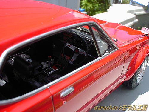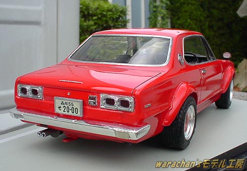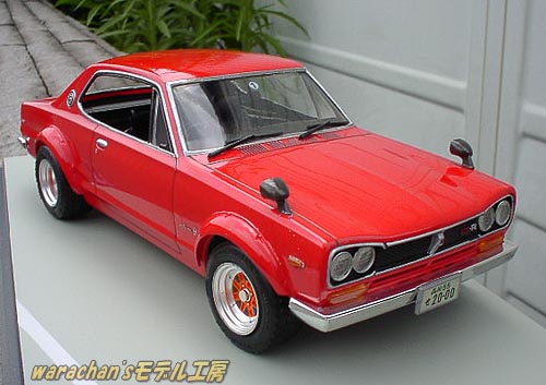 私の作品番号の後ろにRがついているのは、昔に作った作品をリニューアルしたものをあらわしています。このハコスカGT−Rは私が大学生時代、つまり20数年前に製作したものです。けっこう出来もよく気に入っていたのですが、最近の作品に比べると見劣りするので塗装を中心にやりなおしました。