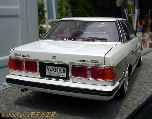 自分の愛車であるCAR-19クレスタを作成したので、1999年静岡ホビーショーはマークU系をテーマにしようと思い製作にあたったものです。ちょうど、キットも有井さんから再販(もともとはエルエス製)されたのでグッドタイミングでした。ただ、このキットのプラスチックは粘り気がある柔らかい品質で、ヤスリがけは少しやり難いです。色は、イメージカラーのツートンと決めたのですが、下半分の色は手に入らず、類似色を使っています。内装はこのころの豪華でけばけばしい雰囲気を出すため、シートはティシューを貼りこみ、色も明るいマルーンと少し暗いマルーンを使い分け、光があたっている部分とそうでない部分の赤みの違いを表現しました。ホールアーチも洋白線ですが、曲面に貼り付けるのは技がいります。 |