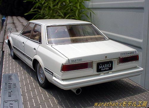このキットで気になる部分は、後ろのテールライト、ナンバープレートあたりのボディ形状が実車と異なります。多分、このクルマはいろいろとマイナーチェンジあり、チェイサー・クレスタの兄弟車ありということで、混乱したのかも知れません。形状の異なる部分はパテで整形してあります。
