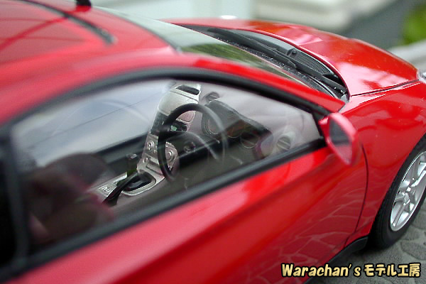 シートは単なる塗りわけだけでなく、赤の部分が角度によっては黒く見える雰囲気が出るように塗りました。サンルーフのガラス色もボディカラーをメッシュを介して裏から吹きつけドットプリントの雰囲気を出しています。
