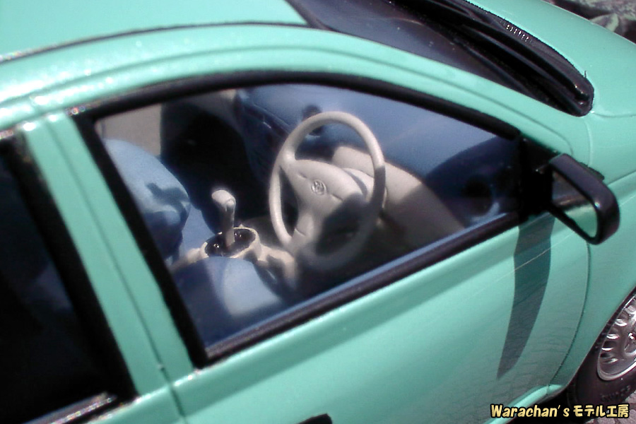 ボディ色は実車の「ライトアクアメタリック」。室内は、Mrカラーの#325、#74、#73の3色をカタログの写真を参考に塗り分けてあります。