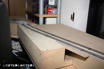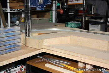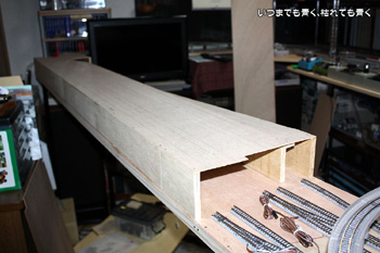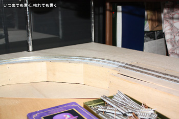 これで狭いスペースでのループではなく、大きなループの線路配置をとることができます。部屋の真ん中に行くときにボードをくぐらなくてはいけなくなったのはちょっと不便ですが、それも大きな目的のためには我慢です。線路プランも出来上がりつつありますので、徐々に形にしていこうと思います。 |