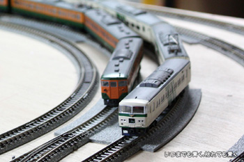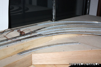 | この編成でも短く感じますので、そういう意味ではこのレイアウトは第一関門は無事に突破ということになります。もうしばらく試走を楽しんでから電気配線を考えたいと思います。 |