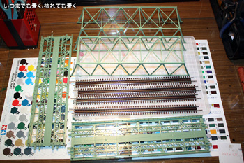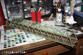今日は、線路の正式敷設に向けて複線トラス鉄橋の塗装をおこないました。基本の色はもともとの整形色に似たライトグリーンとし、その上からサビや汚れを表現しました。あわせてレールのサビ塗装も同時にすませておきました。 |