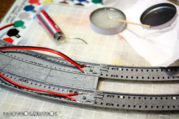 ポイント選択による通電切替は、ポイント内の接点による電圧低下を起こしますので、フィーダは両方の選択側に付けて給電することにします。列車の停止は、ポイント選択連動ではなく、別途トグルスイッチによる操作でおこなうようにします。フィーダーは、クルマの配線用のギボシ端子を付けておき、あとで配線が楽になるようにしておきます。