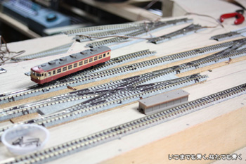 駅の左側(下り方面)に本線と支線をつなぐポイントを組み入れました。これで、本線からは本線にも支線にも入れますし、支線からは本線に出ることができます。ホームの有効長は直線部分で13〜14輌といったところでしょうか。上り側のカーブ部分へ少しホームを延長させることで15輌分の長さの確保を考えていきます。 |