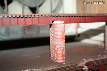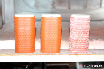 全体をレンガ色に塗装したあと、目地を白くしたり、汚したりしてみましたが、どうもイマイチ。レンガ色が明るすぎるのか、プラスチックっぽさが消えません。もっと実物観察が必要ですね。