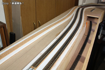 ポップコーアとコルクシートで作成した単線(貨物線)の線路路盤ができましたので、一昨日線路の準備を行い、本日線路の固定を行いました。