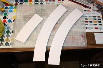 フレキシブルレールを仮置きして、緩やかなカーブの形を写してポップコーアとコルクシートでベースを作っていきます。緩やかなカーブは、ファイントラックのカーブレールとは違い、ベースを作っていてもカーブというより直線に近い感じです。本物の鉄道のカーブもそういう感じなんでしょうね。