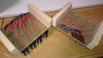 ポイント駆動用のコンデンサ基盤のリード線ハンダ付けもなんとかふたつともやり終えました。 |
