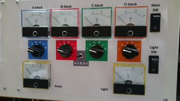 コントロールパネル左半分の走行電源供給スイッチ、ポイントスイッチのパネルです。 |