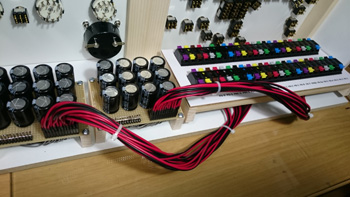 出来上がったターミナルボードをコントロールパネル本体に仮置きて、ポイント駆動用コンデンサ基盤と接続して長さなど問題ないかどうか確認します。 |