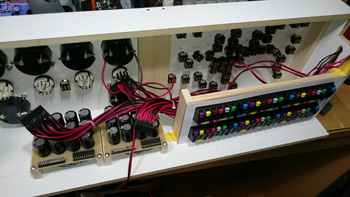 右側はトグルスイッチへの配線が進んでいませんので、スペースに余裕がありますが、配線をすべて行うとここもリード線でいっぱいになります。 |