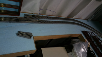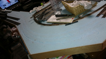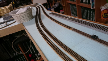 カーブはフレキシブルレールでリアルなカーブにしたい気持ちはありますが、HOは緩和曲線がなくても大きいせいでリアルに見えることがわかっていますので、ここは割り切って既存の道床レールを使うつもりです。 |