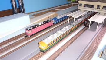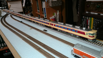 N(9mm)の線路をとっぱらったあとに、HO(16.5mm)の線路を置いてみました。Nで15輌編成も余裕だった駅部分は、1/80だと6輌編成がやっとです。フル編成は無理だけど、見え方や走らせるスピードなどNとは桁違いにリアルなので、短編成でも絵になって走らせて楽しいです。手前のスペースにはNの複線エンドレスを置いて、フル編成も楽しめるようにするつもりです。遅きに失したHO(正しくは16番というのでしょうが)デビューです。 |