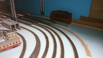 | せっかく敷設したNゲージの線路を剥してHOゲージの線路を敷設していきます。 |
