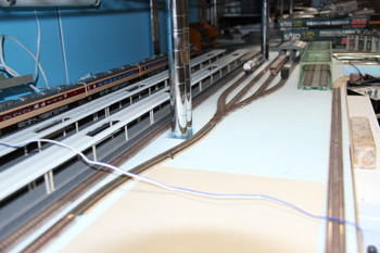HOの線路をNの線路の上に仮設して、カーブとかの雰囲気を確認しています。思ったほど急カーブには見えないしいい感じです。 |