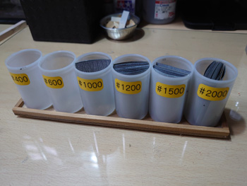 | 昨日盛ったパテを整えようと思って作業を始めたら、使いやすい600番の切り出したペーパーが無くなりました。切り出し前のストックが一枚くらいあるだろうと思って探しましたが、肝心の600番だけありません。600番のような荒目のものはカーモデルにはあまり使わないので、買っていなかったのも仕方がありませんが、欲しいものだけがないというのはやる気を削がれますね。少し効率が落ちますが、800番で代用します。 |