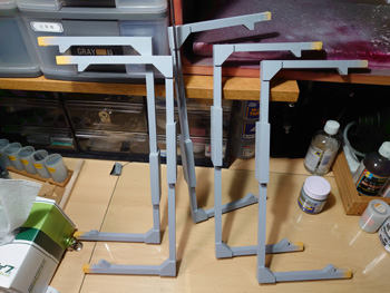 | 高架線支柱をグレーのサーフェサーで塗装。本塗装しなくても雰囲気的にこのままでもいいかな。なんとなくそれなりに見えるようになったような気がします。 |