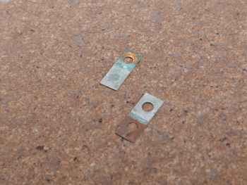 | あらためて換気扇フードが閉まっていた原因を調査しました。このしくみは、防火ダンパーと言うそうで、火災時に内部の熱気や炎が外に出ないようにするためのものだそうです。換気扇フードの下を調べると、金具がひとつ落ちていました。バネに残っていた金具と並べてみると、このふたつはハンダでひとつにくっつけられていて、バネと金属板の間に取り付けられていたようです。通常ならば高温にならないとハンダが溶けて離れることはありませんが、たぶん劣化でハンダが剥がれふたつに別れて防火金属板が閉まったということみたいです。いつそうなったかはわかりませんが、金属金具の状態からそんなに前ではなさそうです。 |
