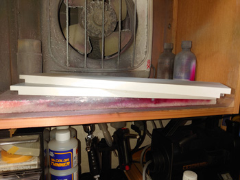 サーフェサーを吹き付けたらスチレンボード(発泡ボード)の切り口が気になったので、切り口にラッカーパテを塗りました。アホですね。スチレンがラッカー成分で溶かされて引けてしまいました。ちゃんと乾燥するかどうかも怪しいです。こんな初歩的なミスをするなんてどうかしてますね。 |