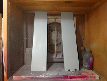 | 塗装時に噴霧した塗料が換気扇に吸い込まれずに戻ってくるような感じがしていました。おかしいなと思ってはいましたが、換気扇は回っているし、構造も簡単なので、換気扇に問題があるなんてことはまったく考えていませんでした。たまたま今日、外に出た時に換気扇をつけたままにしているのに換気扇フードから風が出ていないことに気づいて、下から覗いてみたら、空気の出口全体に鉄板が降りていて完全に閉じられていました。鉄板は、通常はバネで上に上げて固定されているようですが、バネが外れて下に降りてしまっていました。何かを感知して自動的に閉まるものなのか、誰かが故意に降ろしたのか、いつからこうなっていたのか、よくわかりませんが、ここが閉じていたということは、最近の塗装は閉め切った部屋の中に有機成分をまき散らしていたことになり、健康上とても危険な状態だったということになります。たまたま今日偶然に見つけることができましたが、そうでなければ、おかしいなと思いながらもそのまま使っていた可能性もありました。おかしいなと思ったらすぐに調べないとダメですね。 |