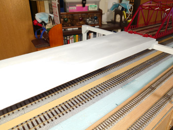 | 昨夜失敗した高架線路盤の側面ですが、最初から側面を処理しなかったのがそもそも間違いだったと反省し、今夜は側面にボール紙を貼り付けました。幸いにも昨夜盛ったパテは硬化していて徐々に溶けていくということはなさそうです。 |