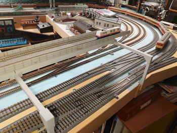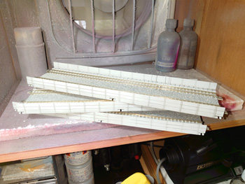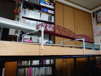 | 大トラス鉄橋のレールの側面を塗って、トラスの塗装艶を抑える塗装を上塗りして、高架線線路の側壁を塗って(少し汚しも入れて)、それらをレイアウトに固定するところまで進みました。 |