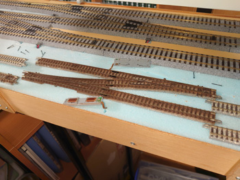 | Nの地上線の複線には両渡り線(ダブルクロスポイント)を2ヶ所入れてありますが、機関区に入るところの両渡り線はオーバースペックなので、片渡り線に変更しました。ポイントマシンの位置も変わりますし、敷設後の線路取り替えはかなり面倒なので迷いましたが、まだ情景の作り込み前なのでなんとか無事に取り替え工事を終えることができました。使わなくなったダブルクロスポイントは、新幹線用の高架線(工事中)に使います。 |